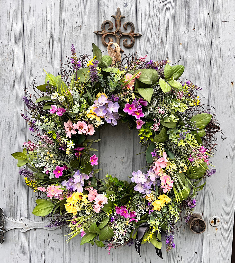 Perfect for spring and summer styling, Riverside Cottage looks equally lovely on a front door, garden room, porch, or inside as a relaxed floral accent.
