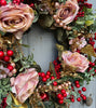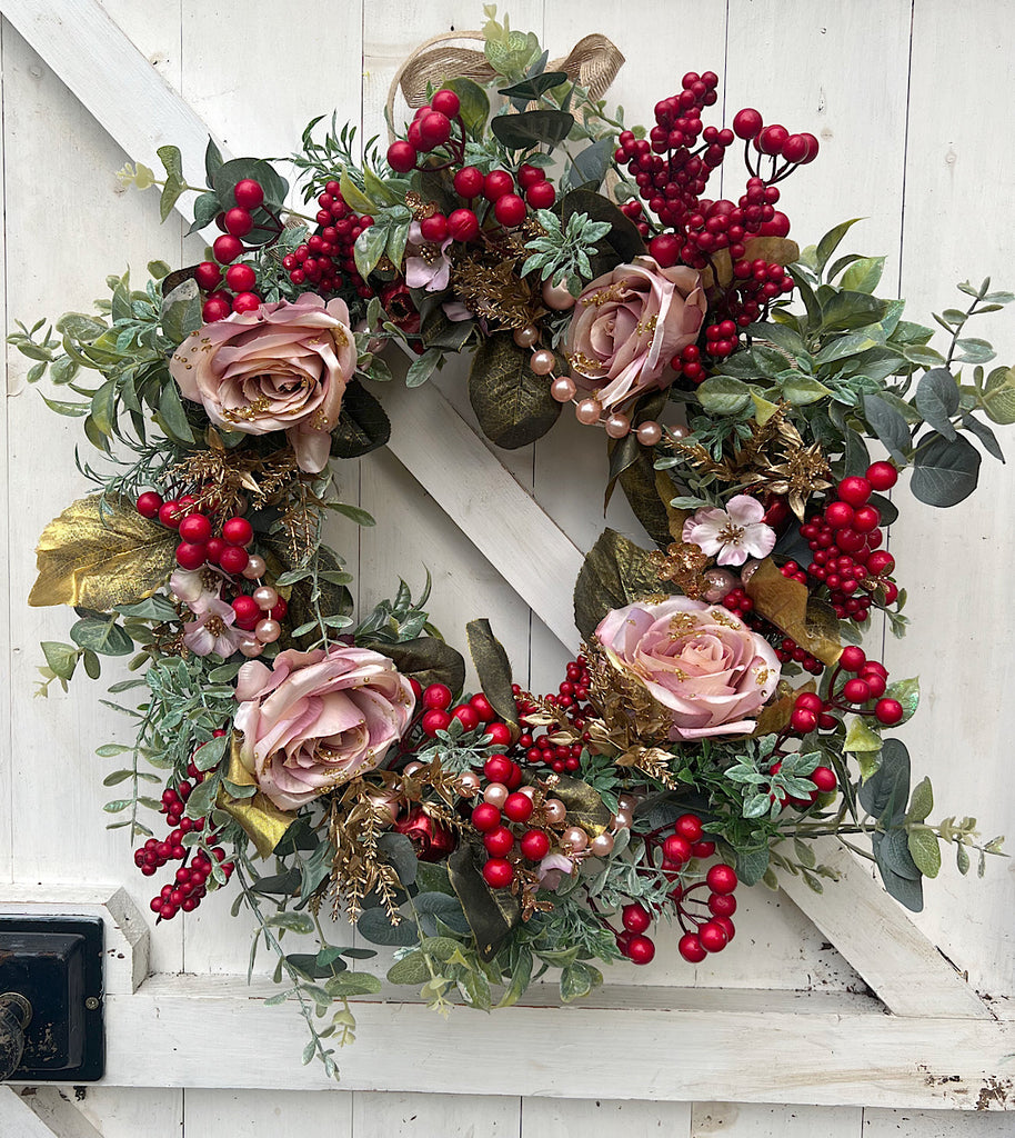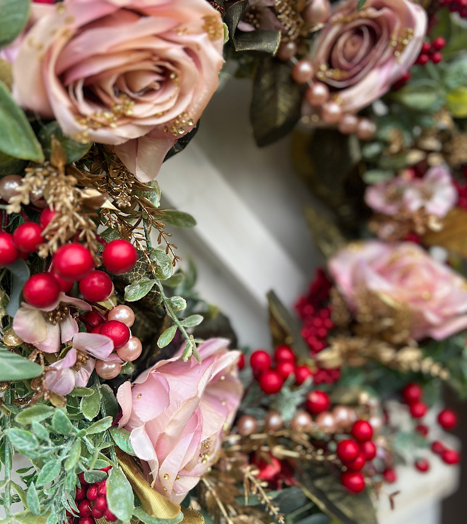 Add a touch of luxury and romance to your home with Pearls & Petals, a stunning handcrafted wreath blending soft blush florals with rich festive berries. This design features elegant pink roses dusted with gold glitter, clusters of vibrant red berries, shimmering gold foliage, pink baubles and strands of soft pink pearls woven throughout for a refined, feminine finish.