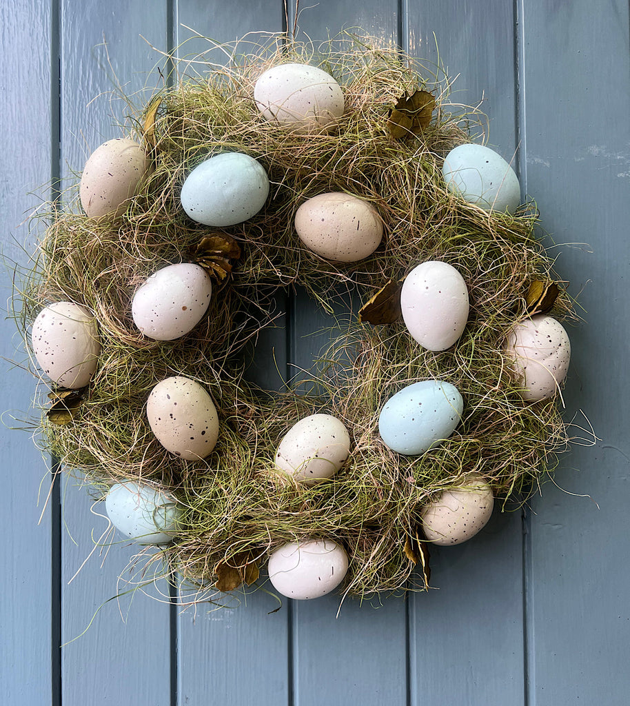 Decorate your front door or home this Easter with this beautiful rustic wreath. Adorned with vintage inspired eggs on a bed of straw and foam base