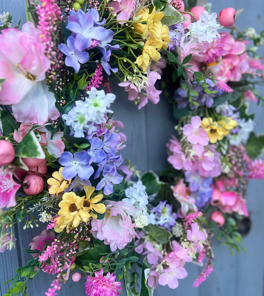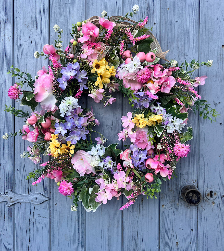 Bring the beauty of a blooming spring garden right to your door with Wild Blossom. This vibrant faux floral wreath is bursting with soft pinks, delicate lilacs, cheerful yellow blooms and lush greenery, creating a joyful display that feels fresh, romantic and full of life.