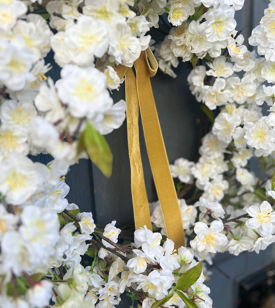 Welcome the beauty of spring into your home with our White Cherry Blossom Faux Floral Wreath. Delicately crafted with lifelike white cherry blossoms and soft greenery with a seasonal velvet ribbon, this wreath adds a touch of elegance and serenity to any space without the worry of wilting leaves.