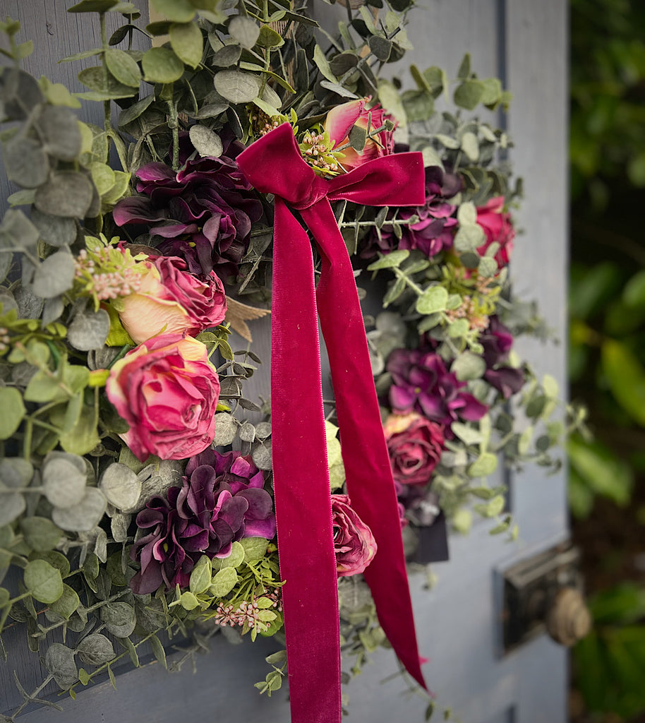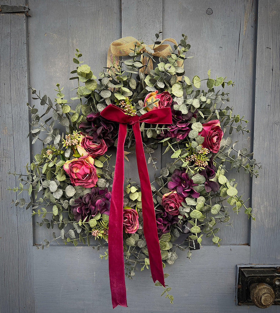 This winter/Christmas floral wreath features a stunning arrangement of realistic-looking deep burgundy roses, hydrangeas, spiral eucalyptus and foliage with a beautiful velvet ribbon. Perfect for a cozy, seasonal touch to any home or door, this wreath combines warmth, sophistication and the beauty of nature.