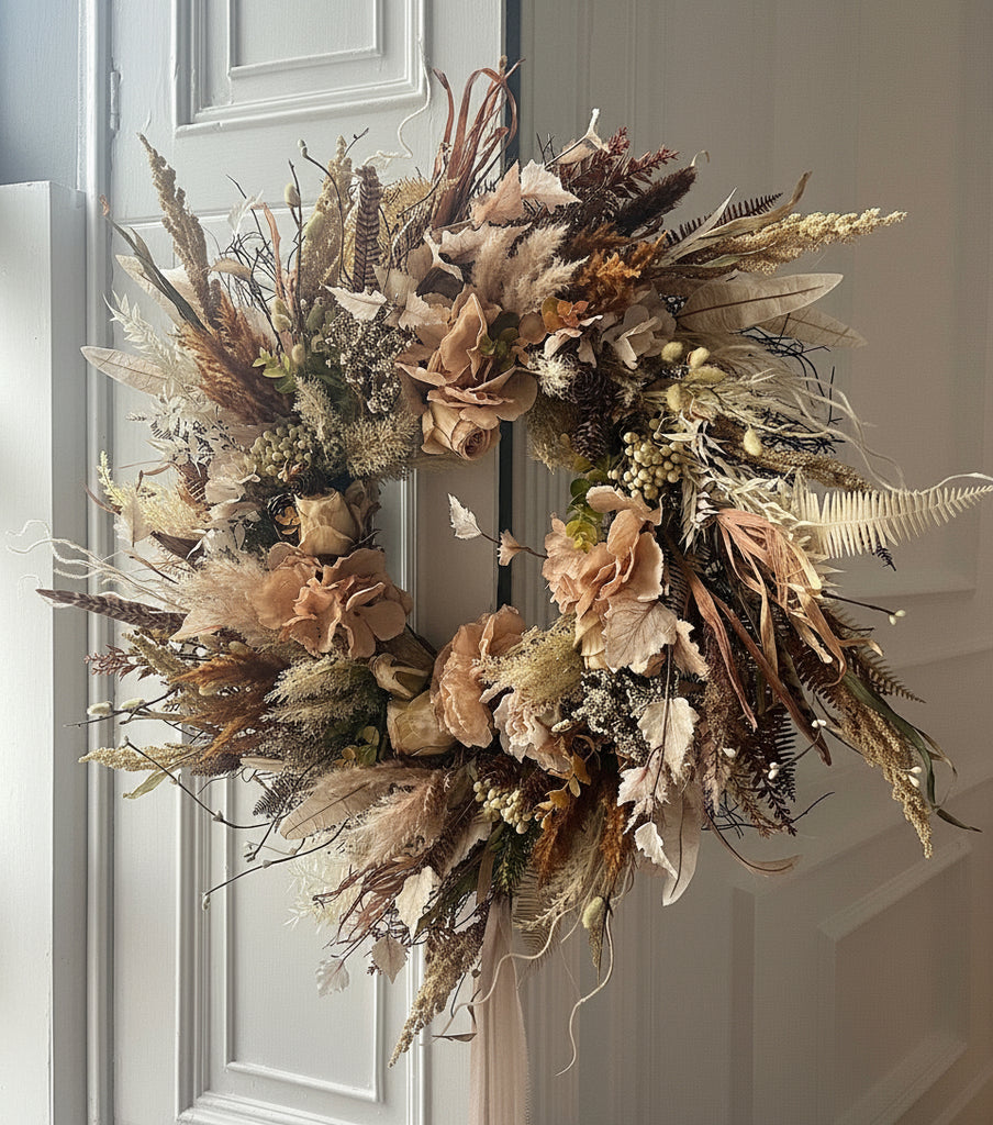 Softly faded tones and rich autumn textures come together in Wheat & Whisper, a beautifully handcrafted artificial wreath designed to capture the charm of dried florals, without the fragility.