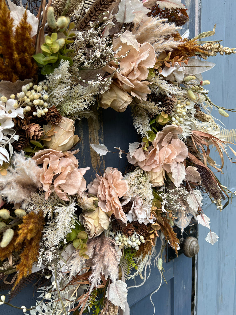 Layers of toffee and cream-toned dried-effect roses and hydrangea, autumn blooms, feathery grasses, preserved-look foliage, pheasant feathers and seed heads blend seamlessly to create a timeless, nature-inspired piece. Each element has been thoughtfully arranged to mimic the effortless beauty of dried botanicals, giving you that warm, organic aesthetic that lasts season after season. Finished with brown velvet and silk ribbons on a loose weave base.