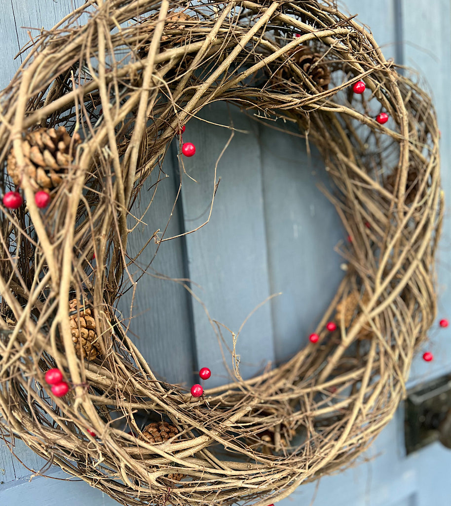 Keeping it simple with this beautiful wicker willow wreath adorned with acorns and red berries for a paired down rustic look perfect for Autumn, Christmas and Winter. Keep it simple or use as a base to add your own artificial, dried flowers and ribbon. Twine rope attached for hanging.