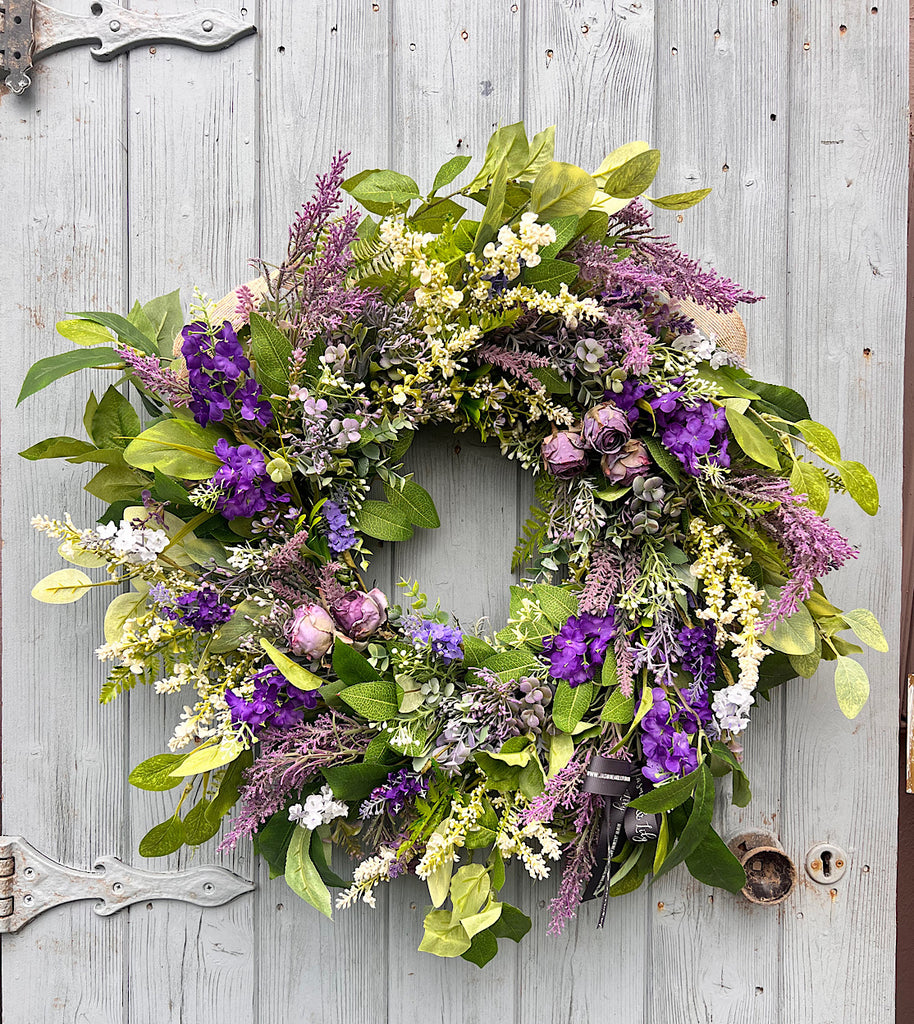 Wild Rose & Lavender is a romantic faux floral wreath inspired by overgrown cottage gardens and soft summer evenings. Featuring dried-effect rose blooms nestled among fragrant-looking lavender sprigs, wild greenery, and delicate meadow florals, this wreath brings a sense of calm, beauty, and timeless charm to any space.