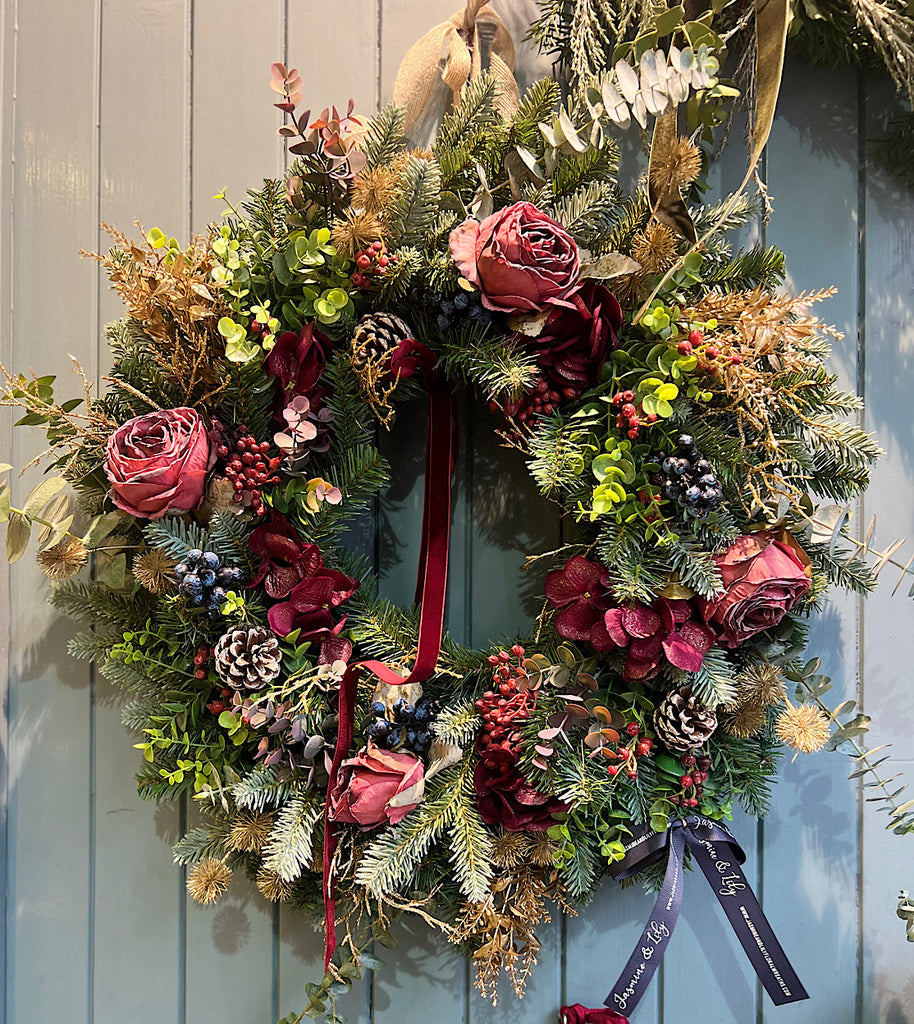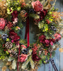 Gorgeous dried effect burgundy roses, eucalyptus, cones, hydrangea, mixed pine and spruce foliage, navy berries, gold foliage with a festive burgundy and gold bow ribbon