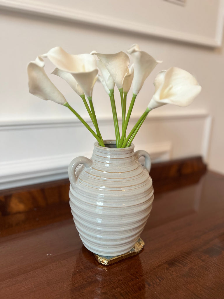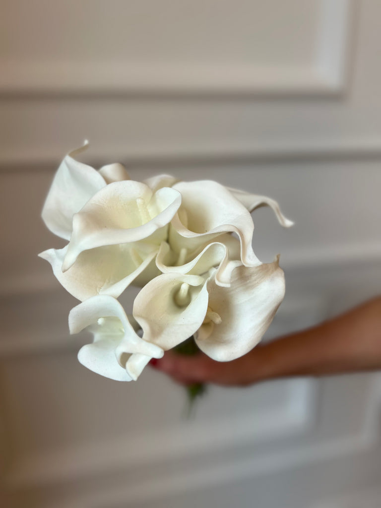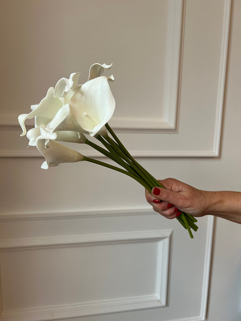 Bring timeless beauty into your home with these exquisite faux calla lilies. Each stem features gracefully curved blooms in a soft ivory-white hue, perfectly capturing the sculptural elegance of real calla lilies. Crafted with lifelike detail and a natural touch finish, these blooms add sophistication to any arrangement, from minimalist interiors to romantic floral displays.